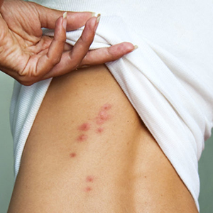 When bed bugs feed, they inject their “beak” into the skin and their saliva acts as an anticoagulant to bring up the blood meal, their bites are usually painless and are not usually noticed at the time. Although individual responses vary, the common reaction is for the skin to become red, inflamed and irritated. Often the skin lesions are unnoticed or mistaken for flea or mosquito bites or other skin conditions. Rashes range from localized red and itchy spots arranged in a linear fashion to the development of a series of two to three low itchy welts or lumps filled with liquid or blood that may take weeks to go away. They prefer exposed skin, preferably the face, neck and arms of a sleeping individual.