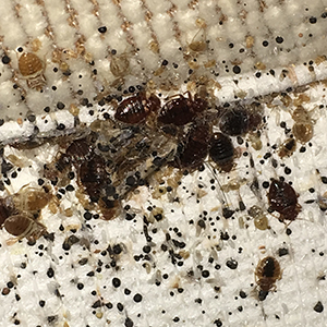 Bed bugs are elusive and usually nocturnal which can make their detection difficult. They often lodge in dark crevices, and the tiny adhesive eggs can be nestled by the hundreds in fabric seams. Aside from bite symptoms, signs include fecal spots (small dark sand-like droppings that occur in patches around and especially beneath nests), blood smears on sheets (fecal spots that are re-wetted will smear like fresh blood), and the presence of their empty molted exoskeletons.