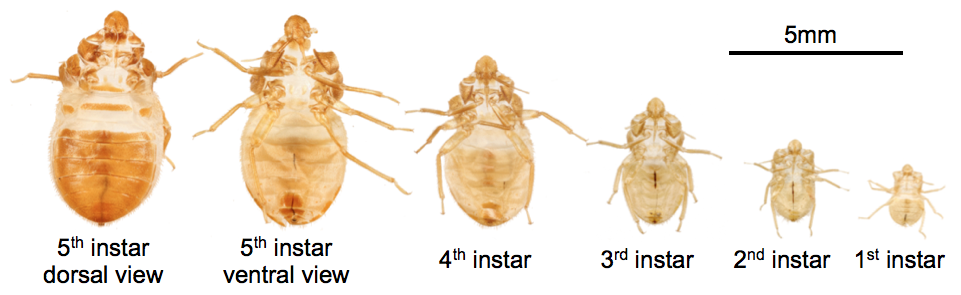 A female is capable of laying hundreds of eggs over her lifetime, depending on temperature and available hosts. The eggs are difficult to see, are pearl white, translucent in color and display obvious eyespots of the nymph inside when 5 days or older. Eggs are usually laid in small clusters in cracks and crevices, eggs are laid using very sticky glue like adhesive to a site and are very hard to remove by hand. Eggs can hatch anywhere from three (3) to ten (10) days or longer depending on environmental conditions. The nymph stage, which looks like a small adult, is the immature stage of the bed bug, and they need to start to feed immediately. They molt 5 times with each stage ranging from 14 to 30 days. The entire life cycle from the first instar / nymph to adult is typically 4 to 9 weeks, dependent of environmental conditions and availability of a host.
